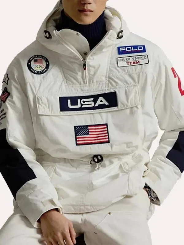 The anorak style includes a high collar, adjustable hood, and front pockets for convenience, while subtle Team USA and Olympic-inspired accents showcase national pride. Perfect for winter outings, casual wear, or supporting Team USA at the 2026 Winter Olympics.