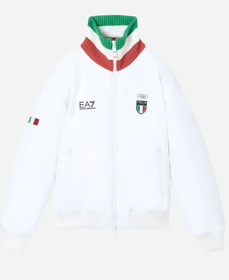 Show your support for Team Italy with the EA7 2026 Olympics Bomber Jacket. Featuring official team logos and EA7 branding, this jacket combines style, warmth, and Olympic pride.