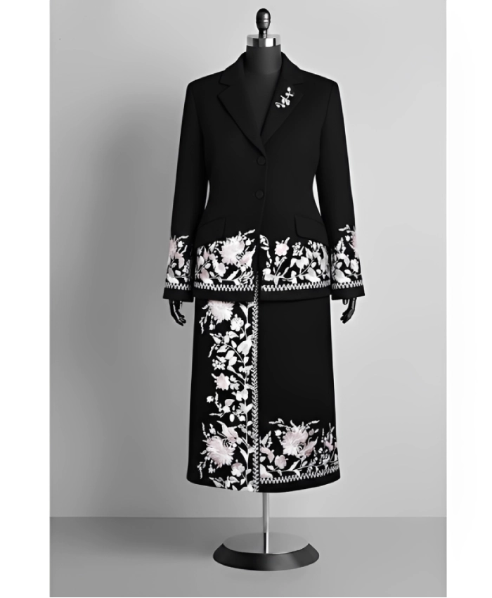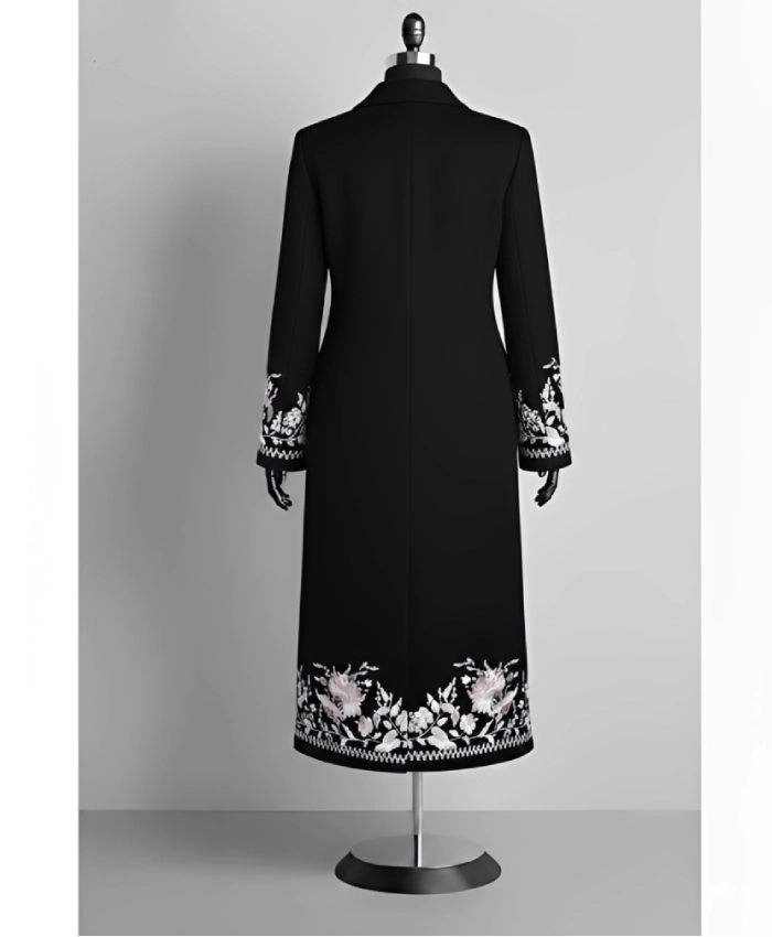 Crafted from premium-quality fabric, it features a tailored silhouette that drapes gracefully for a flattering fit. The intricate floral pattern adds a sophisticated, eye-catching touch, while the longline design provides warmth and style for formal events or evening outings.