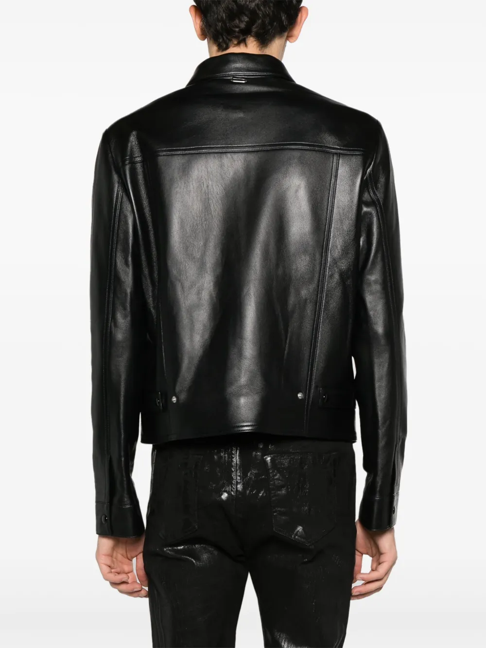 Black Lambskin Leather Trucker Jacket with Buckle