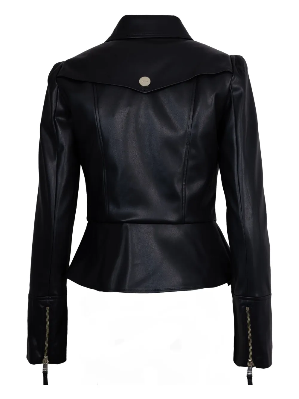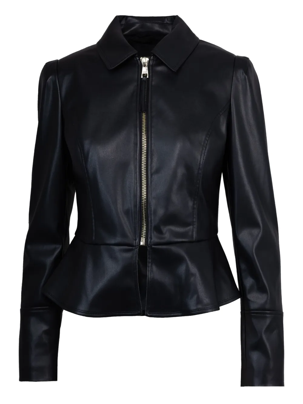 The Black Peplum Zip-Front Jacket offers a chic and flattering silhouette with its peplum design. Featuring a smooth zip-front closure, it combines style and functionality for easy wear. Perfect for work, casual outings, or semi-formal occasions, this jacket adds a polished and versatile touch to any wardrobe.