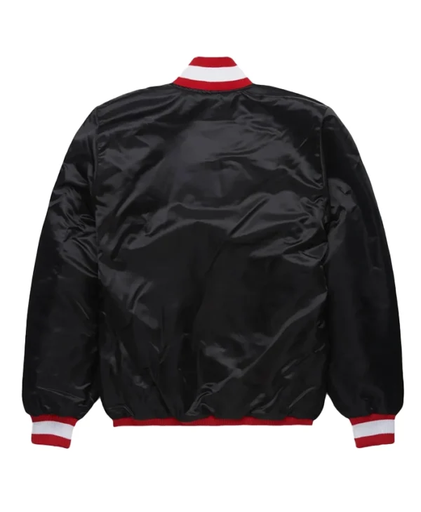Crafted from high-quality satin fabric, it offers a smooth, glossy finish while ensuring durability and comfort. The soft inner lining enhances warmth, making it suitable for cooler weather without compromising on style. The full-snap front closure provides a classic varsity-inspired touch, allowing for easy wear and a secure fit.