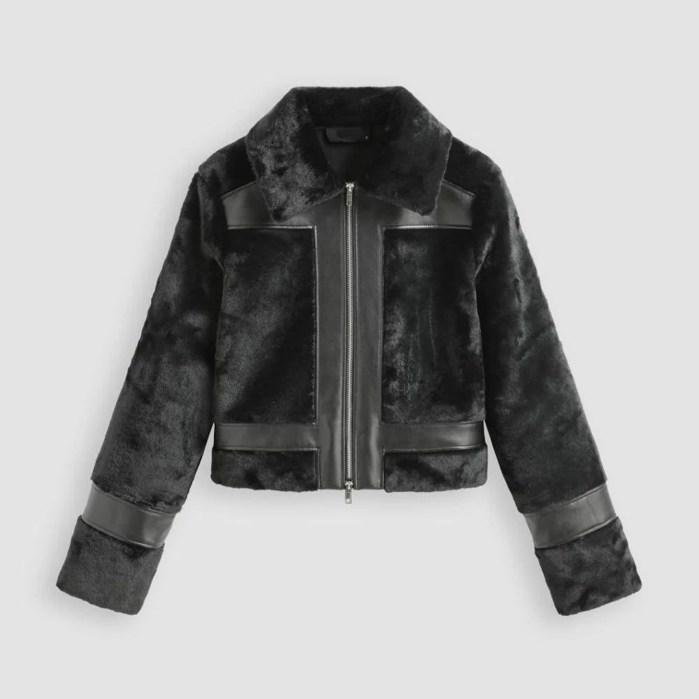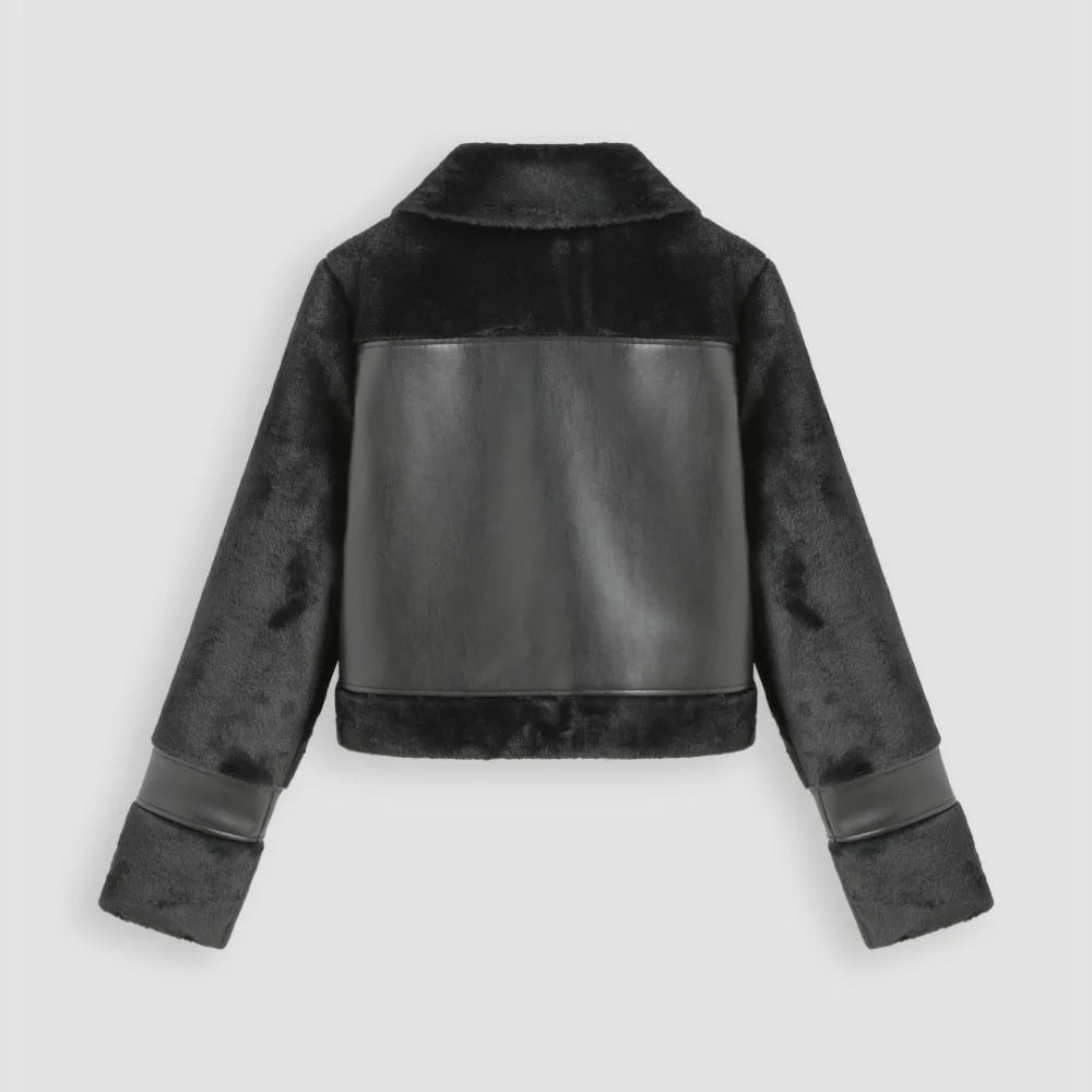 Cropped Faux Shearling Jacket with Leather Collar and Patches