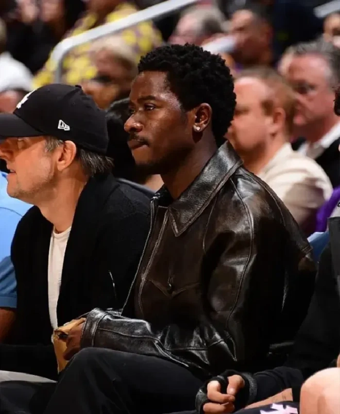 Inspired by Damson Idris’ courtside Lakers look, this black leather jacket brings bold celebrity style to your everyday wardrobe.