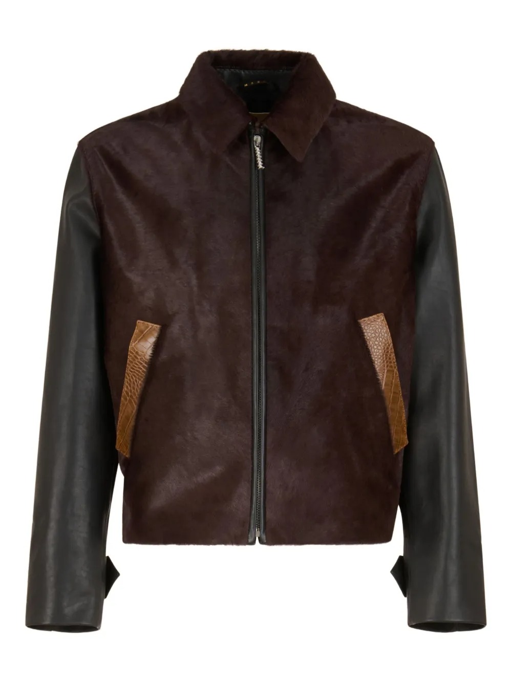 Make a bold statement with this Dark Brown Calf-Hair Leather Jacket, featuring striking snakeskin-print pockets for a touch of luxury and edge. Its rich texture, premium finish, and tailored silhouette create a standout piece that elevates any outfit. Perfect for those who appreciate unique detailing and high-end style.