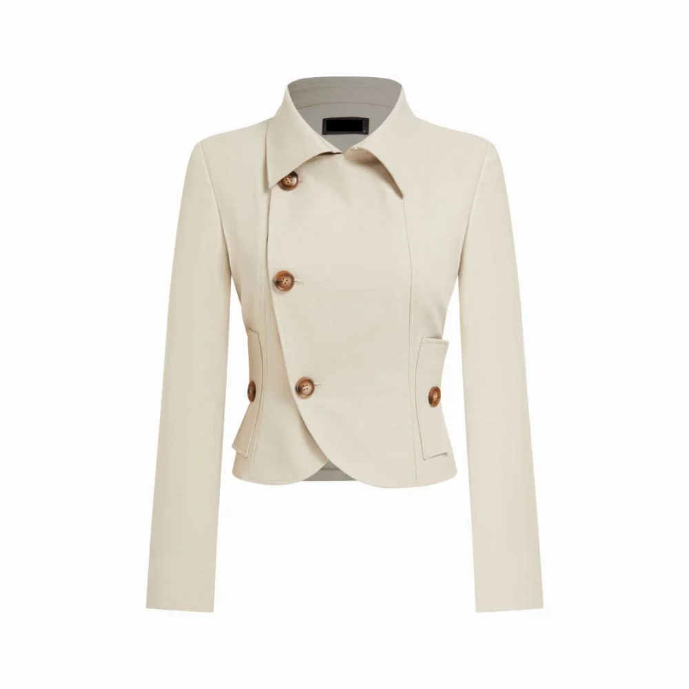 Step out in style with the Elyse Asymmetrical Hem Cropped Jacket. Featuring a modern asymmetrical hem and a sleek cropped fit, this jacket adds a contemporary edge to any outfit. Perfect for layering over casual or chic ensembles, it combines fashion-forward design with everyday versatility.