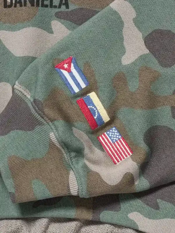 Crafted from premium cotton-blend fleece, it offers a soft, breathable feel with long-lasting durability. The cropped, oversized silhouette delivers a modern Y2K-inspired fit, making it perfect for layering and casual styling. The front showcases a distressed arch logo print, while the sleeve features flag detailing representing Cuba, Venezuela, and the United States, adding a personal and cultural touch.