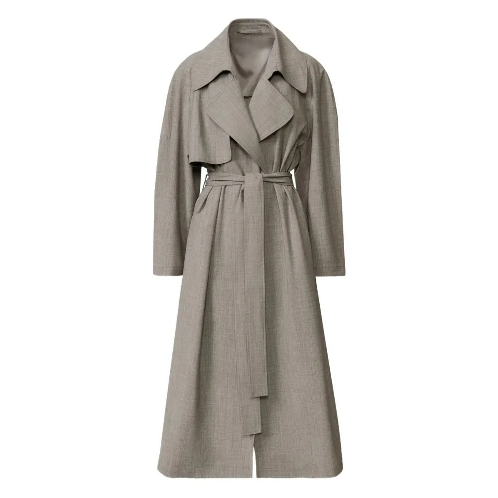 This grey belted trench coat combines classic elegance with modern style. Featuring a structured collar, adjustable waist belt, and a long tailored silhouette, it provides a flattering fit for everyday wear. Crafted from durable fabric, the coat offers warmth and versatility, making it perfect for both casual and formal outfits.