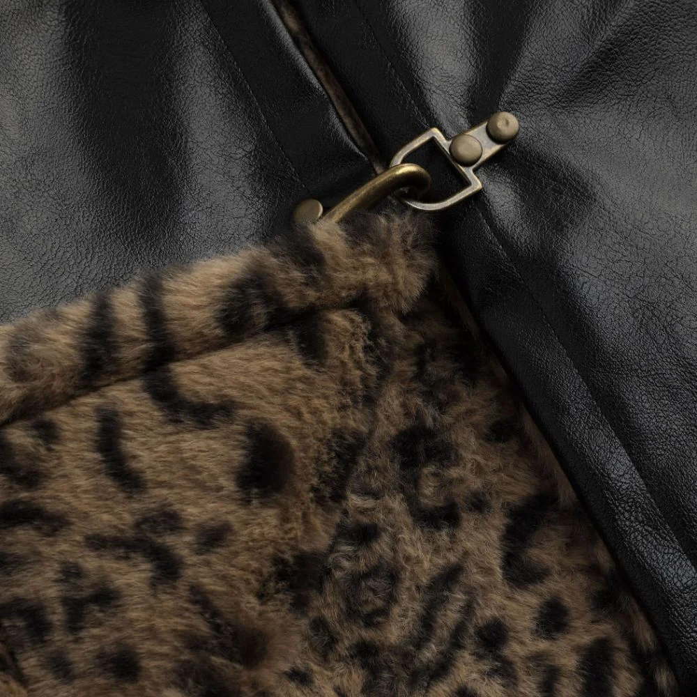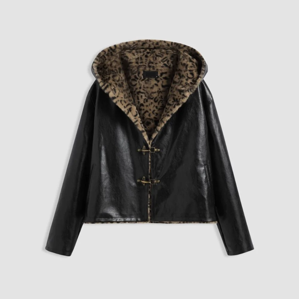 Stay cozy in style with this hooded faux shearling jacket featuring a bold leopard-print lining. Soft, warm, and effortlessly chic, it’s perfect for layering over casual outfits while adding a touch of playful flair.