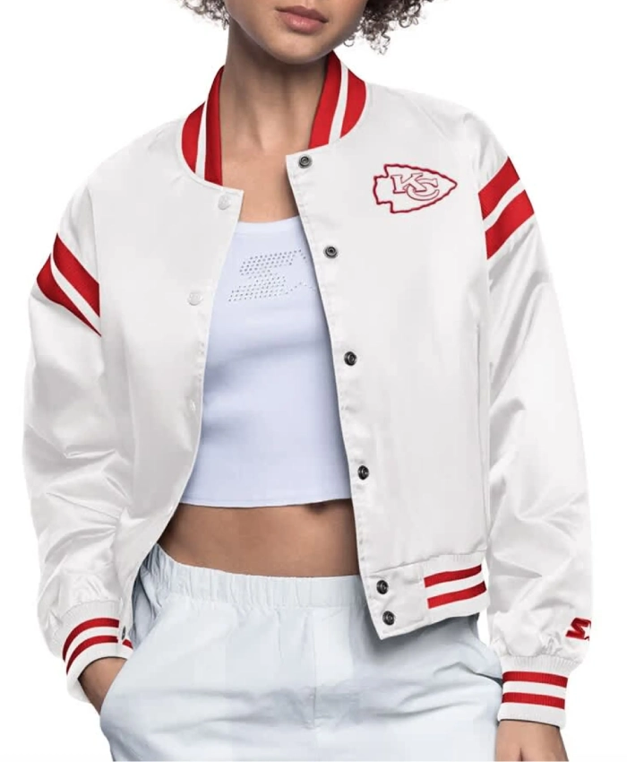 Featuring a full snap-button front, it offers a timeless varsity-style design that is both functional and fashionable. The crisp white color enhances its bold appeal, while the Kansas City Chiefs-inspired detailing adds a strong touch of team pride. Inside, a soft lining ensures warmth and comfort, making it suitable for everyday wear or cooler game days.