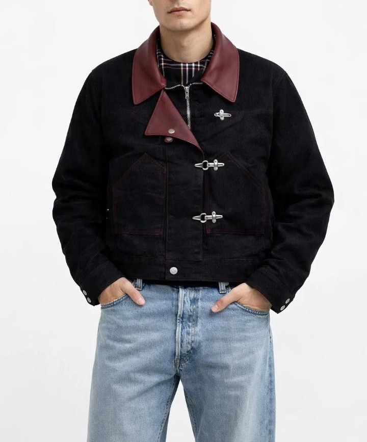 Elevate your style with this men’s black denim jacket, featuring a classic leather collar and distinctive fireman clasp closure. Crafted from durable denim with premium leather accents, it offers a rugged yet refined look. Designed for comfort and versatility, this jacket is perfect for casual outings, streetwear, or layering in cooler weather.