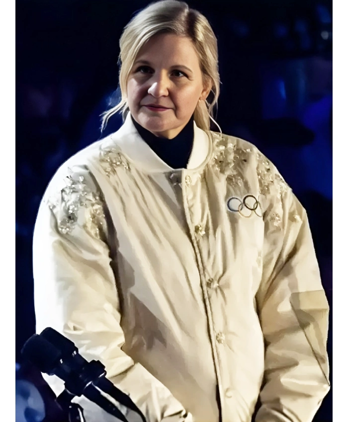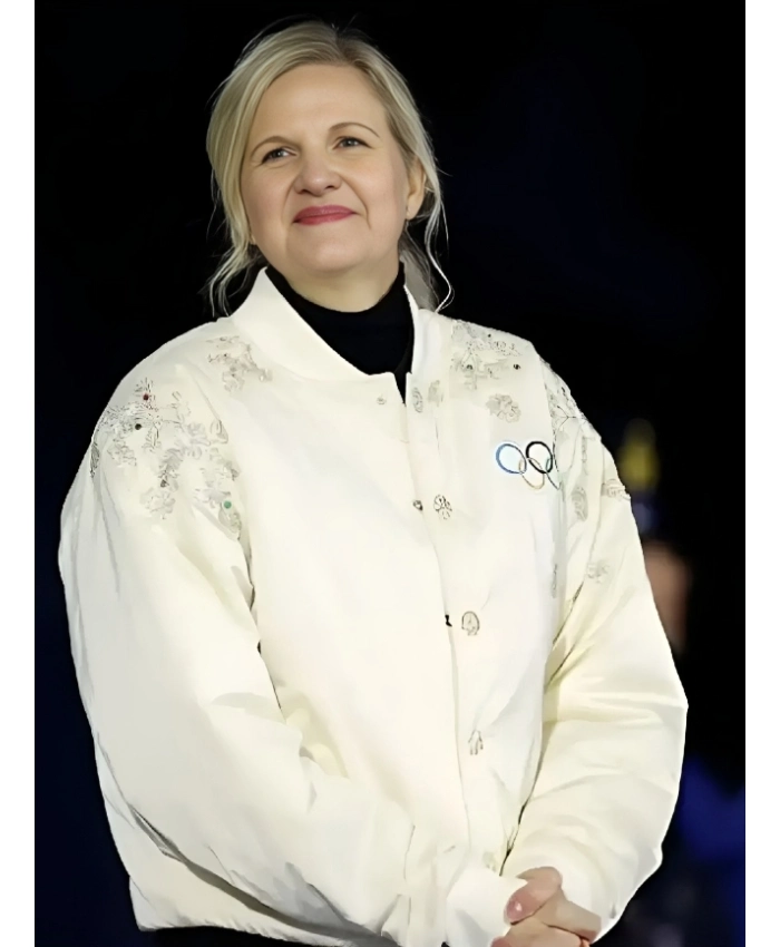 Celebrate Olympic elegance with the Kirsty Coventry Milano Cortina 2026 Olympic Closing Ceremony Jacket, inspired by the stunning look of Kirsty Coventry during the closing ceremony of the Milano Cortina 2026 Winter Olympics. This stylish white jacket blends sporty functionality with a refined, ceremonial aesthetic, featuring a bold floral and Olympic logo design that makes it a standout piece.