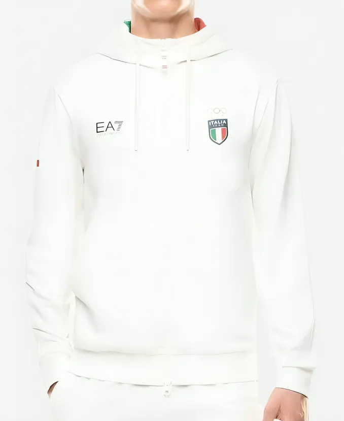 Emblazoned with Team Italy branding and the iconic EA7 logo, it captures the energy of the Winter Games while offering practical features like a spacious front pocket and adjustable drawstring hood. Ideal for fans, athletes, or anyone who loves high-performance, stylish sportswear.