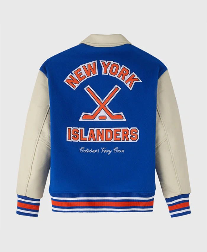 Blend premium streetwear with team pride in the OVO New York Islanders Blue & Beige Varsity Jacket. Featuring a stylish two-tone design, this jacket combines OVO’s signature aesthetic with classic Islanders heritage for a bold and refined look.