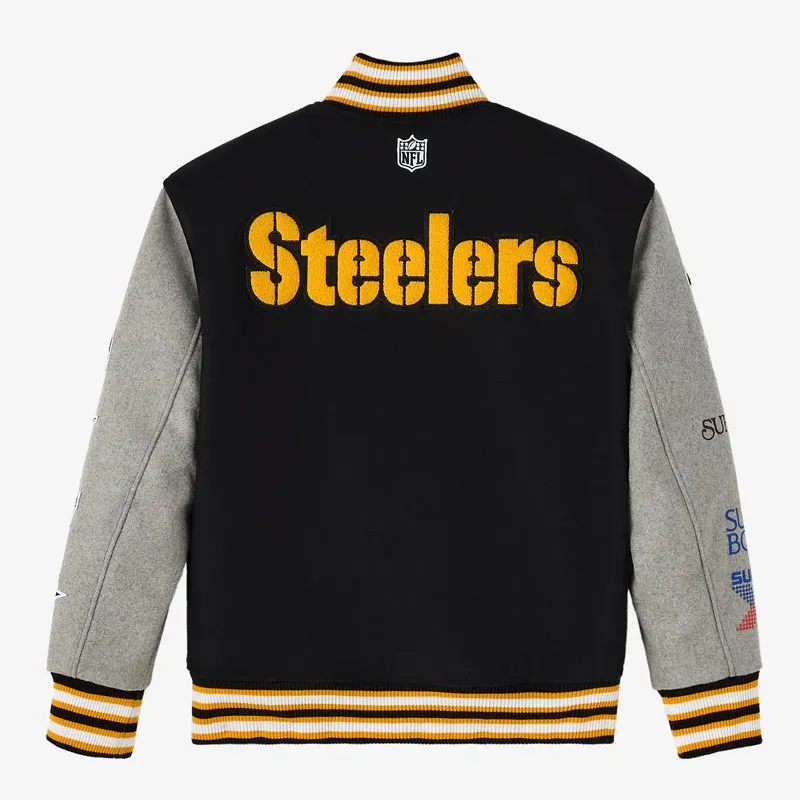 Show your team pride in style with the Pittsburgh Steelers OVO Team Varsity Jacket. Featuring a classic varsity design with black and gray color blocking, ribbed cuffs and hem, and bold team detailing, this jacket offers both comfort and a standout look. Perfect for game days or casual wear, it’s a must-have for every Steelers fan.