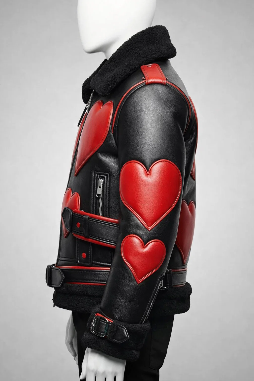 Its bold red heart detail adds a unique, eye-catching touch, making it perfect for casual outings or making a fashion statement. The tailored fit and high-quality construction ensure long-lasting style and cozy wear.