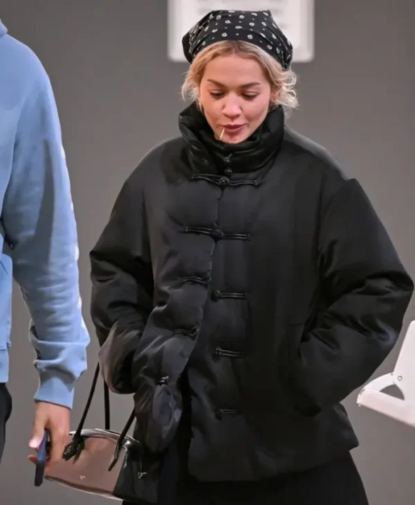 This Rita Ora Black Satin Puffer Jacket looks even better in person. The satin gives it that sleek shine without being too flashy.