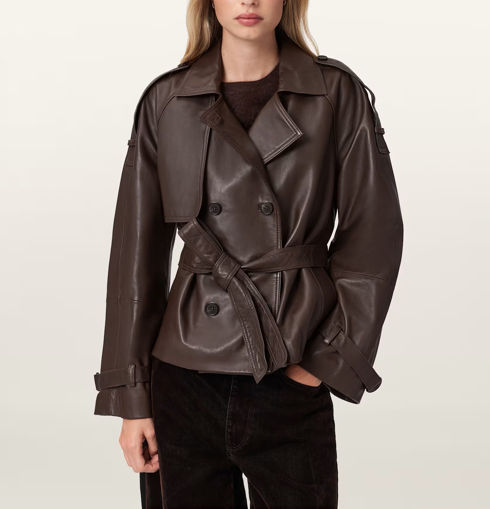 Elevate your look with the Stylish Cropped Leather Trench. Crafted from premium leather, this trench features a tailored cropped fit and clean, modern lines for a chic, versatile appearance. Perfect for layering over casual or dressy outfits, it combines elegance and edge in one timeless piece. Durable, comfortable, and effortlessly stylish, this trench is a wardrobe essential for contemporary fashion lovers.