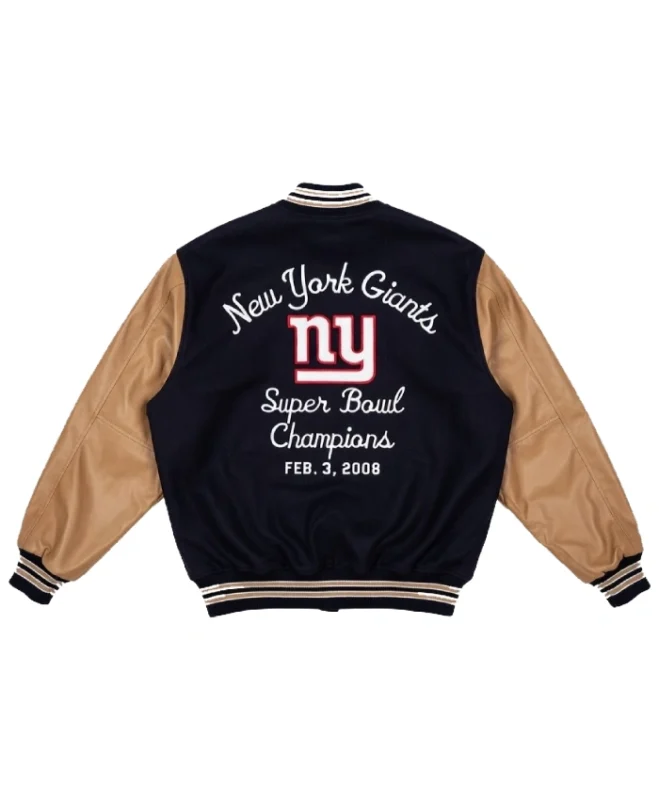 Celebrate one of the most memorable moments in NFL history with the 2008 NY Giants vs Patriots Super Bowl Varsity Jacket, inspired by the epic showdown between the New York Giants and New England Patriots at Super Bowl XLII. This varsity-style jacket honors the Giants’ legendary victory and captures the spirit of football history.
