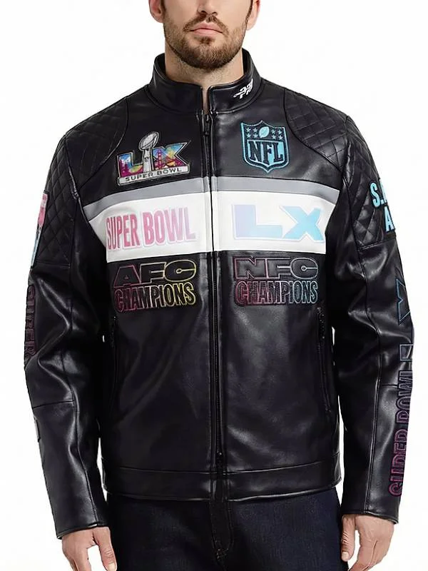 Elevate your game-day style with the Super Bowl LX Black Moto Black Leather Jacket, inspired by the prestige and energy of Super Bowl LX. This jacket combines premium craftsmanship with a bold, modern moto design, perfect for fans, collectors, and anyone who loves sleek NFL-inspired fashion.