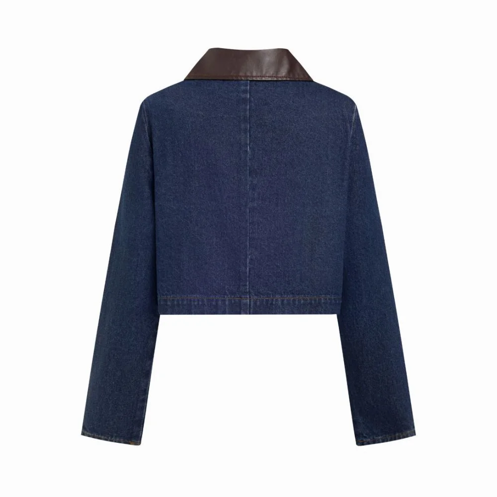 Add a modern edge to your wardrobe with this washed denim jacket featuring a faux leather collar. Designed with gold button details and a relaxed fit, it combines classic denim style with contemporary accents for effortless layering.