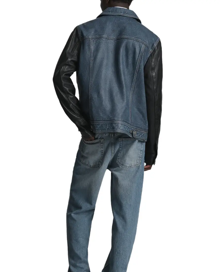 Make a bold statement with the Wilson Beckham Two-Tone Blue and Black Denim Jacket, combining classic denim with sleek leather accents for a modern, stylish look. The two-tone design adds a unique edge, perfect for streetwear and casual outfits.
