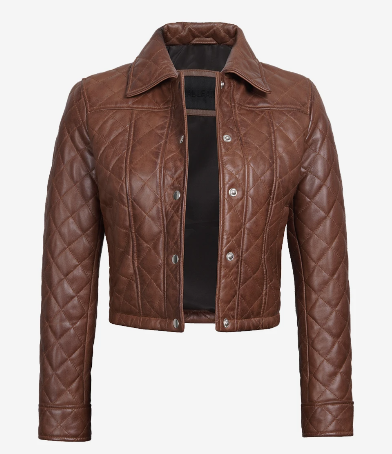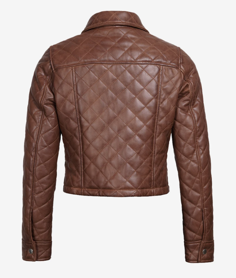Style with the Women’s Quilted Cognac Leather Crop Jacket. Crafted from premium leather, this jacket features a chic cropped fit and quilted detailing for a modern, textured look. Its rich cognac tone adds warmth and versatility, while a comfortable lining ensures all-day wear. Perfect for layering over casual or dressy outfits, this jacket combines edgy style with timeless sophistication.