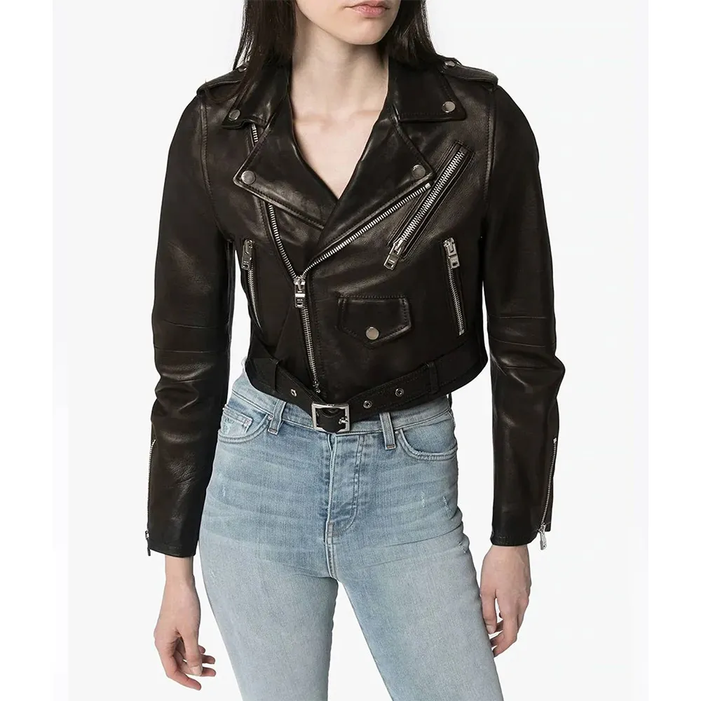 Women’s Sleek Black Cropped Biker Leather Jacket